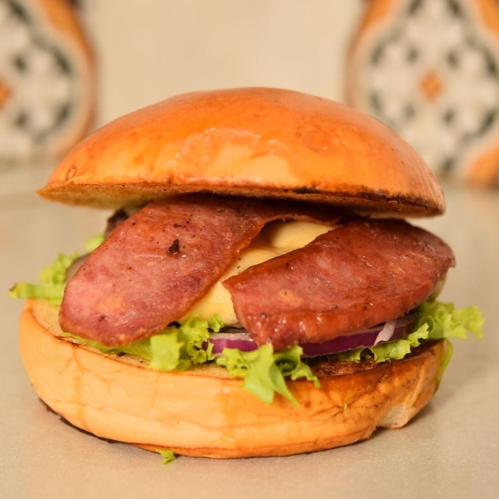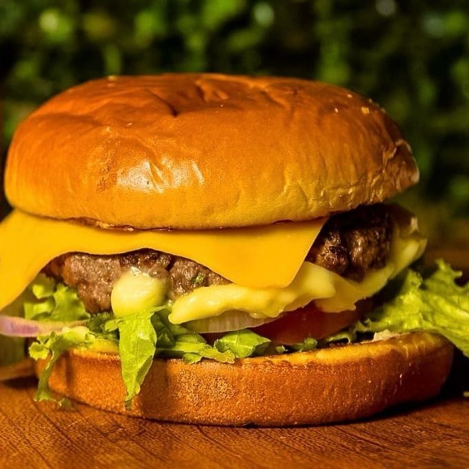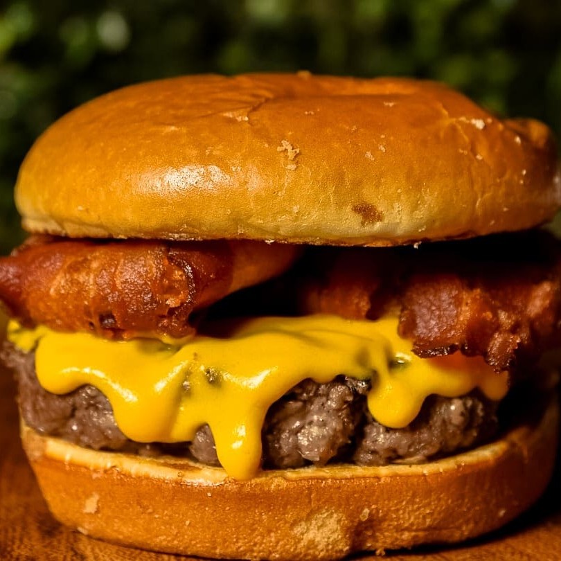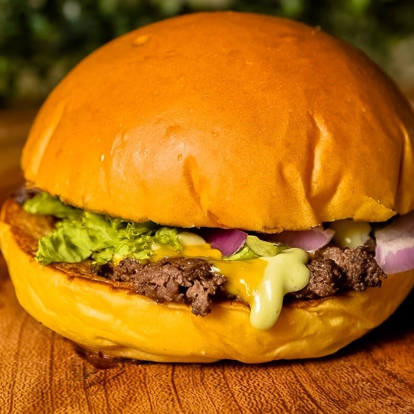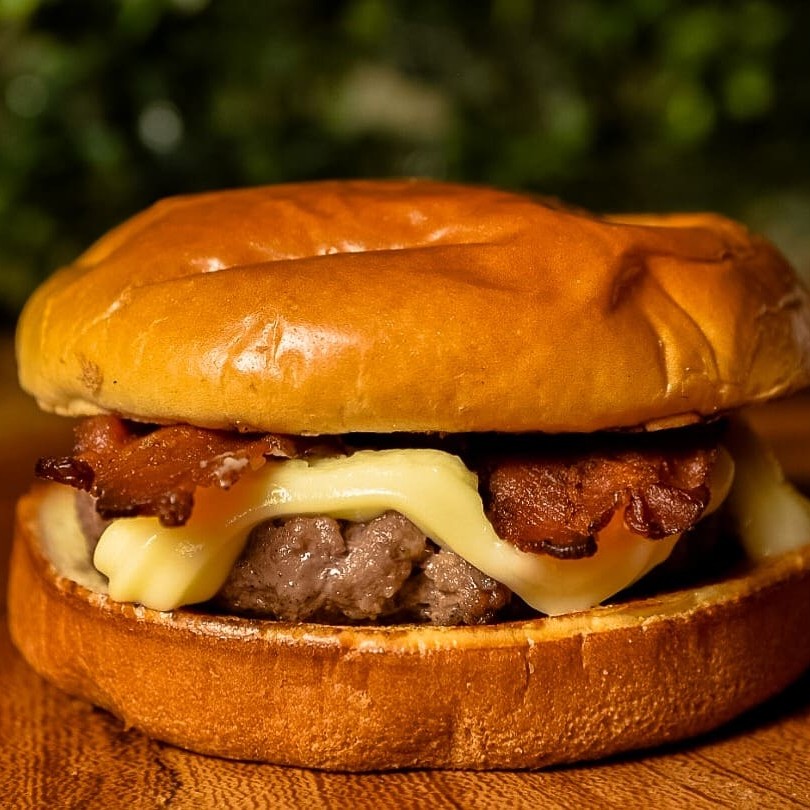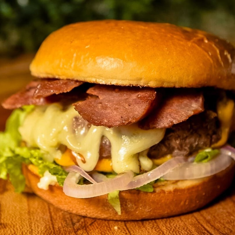 Pão Artesanal, 1 Carne Com Queijo Cheedar Totalizando 80g Fraldinha, Bacon, Alface, Cebola e tomate.