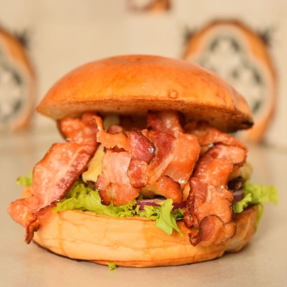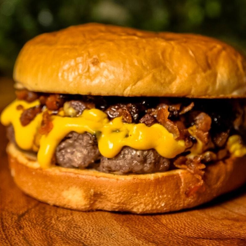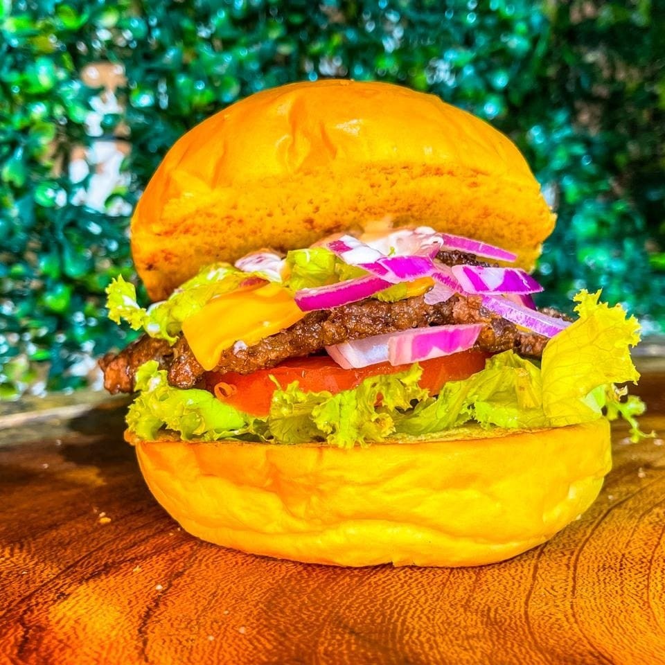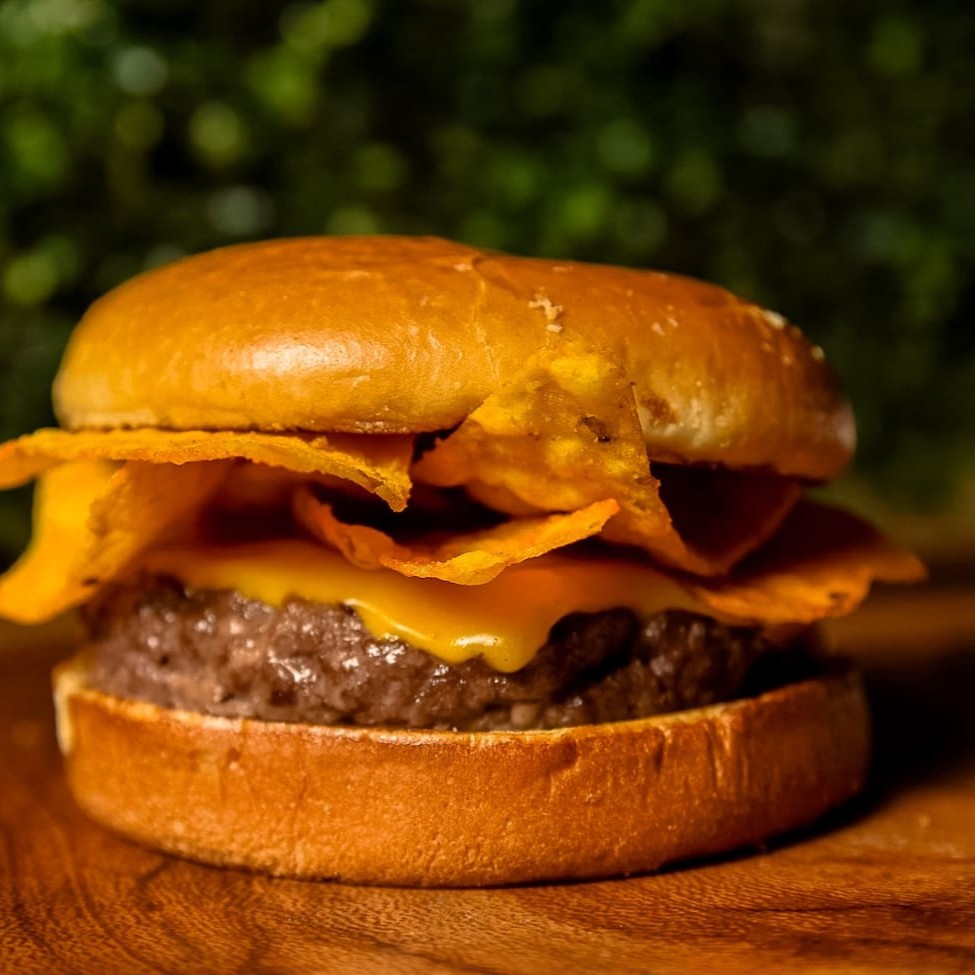 Pão Artesanal, 1 Carne Com Queijo Cheedar Totalizando 80g Fraldinha, Bacon, Alface, Cebola e tomate.