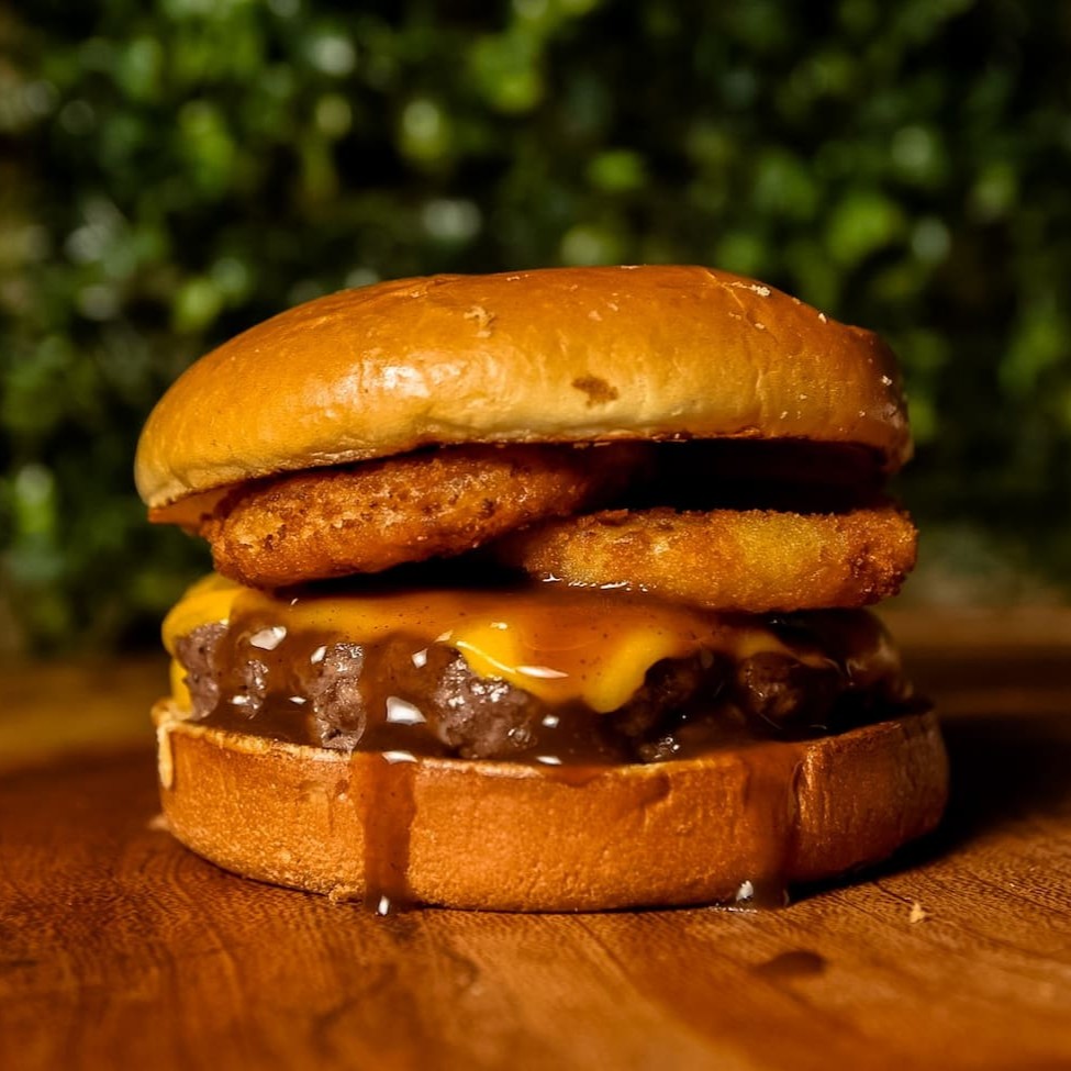Pão Riviera, Blend De Fraldinha De 150g, Anéis De Cebola Fritos (Onion Ring), Molho Barbecue E Queijo Cheedar.