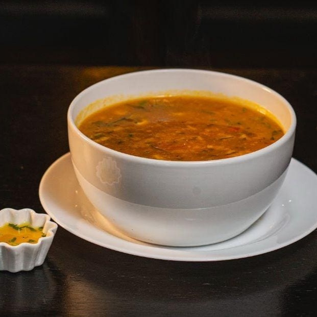 Caldo da chef com leite de coco fresco, proteína de filhote, acompanhado de legumes, pirão escaldado e arroz branco.