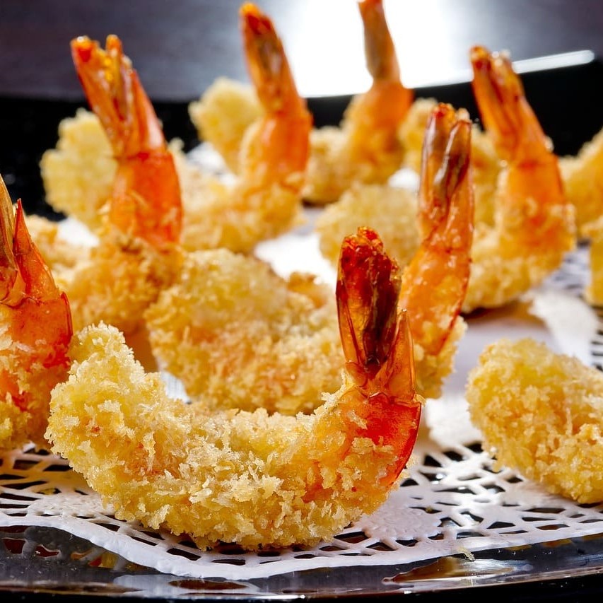 Camarão empanado ao estilo milanesa, acompanha farofa e molho de pimenta.