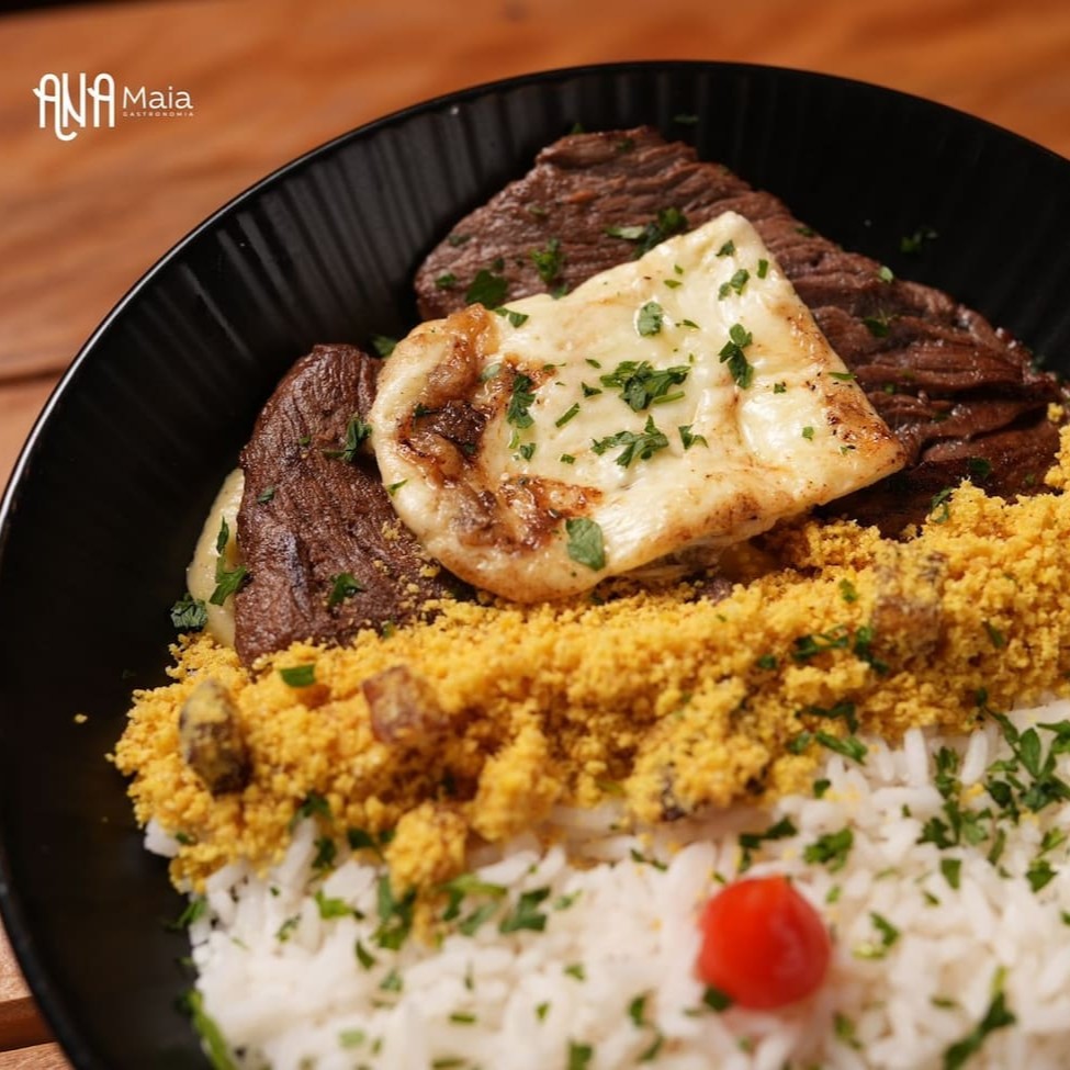 Filé de pescada grelhado regado com redução de tucupi, camarão rosa para decorar, acompanhado de arroz branco & farofa.