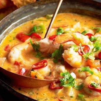 Caldo da chef com toque de leite de coco fresco, proteína de filhote & camarões rosas, acompanhado de legumes, pirão escaldado e arroz branco.