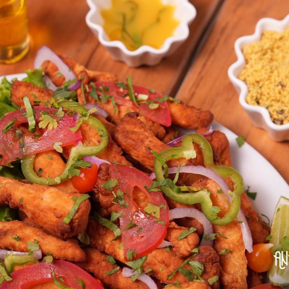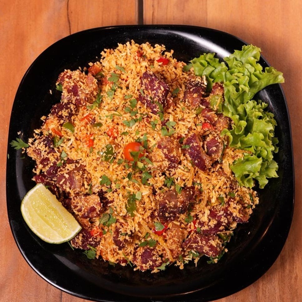 320g de peixe em tiras crocantes, acompanhados de farofa e pimenta tucupi.