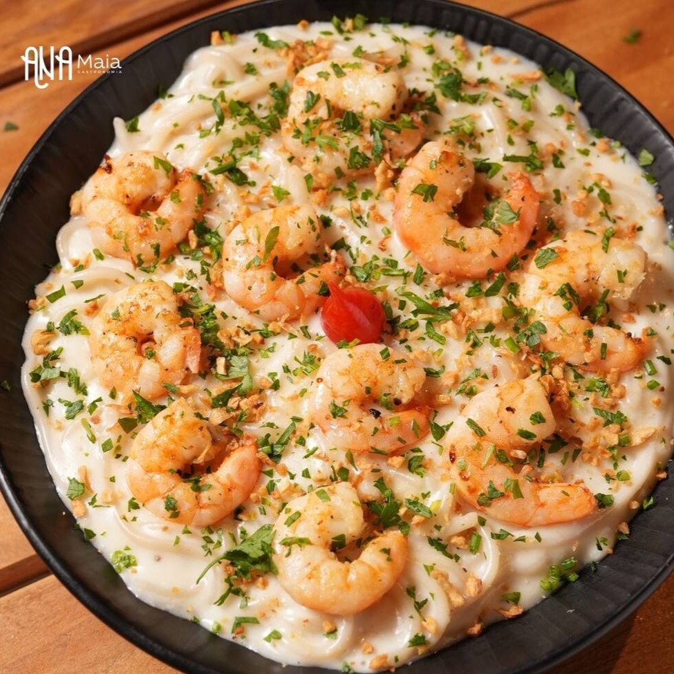 Massa de camarão rosa (08 und gg) servido com molho branco.