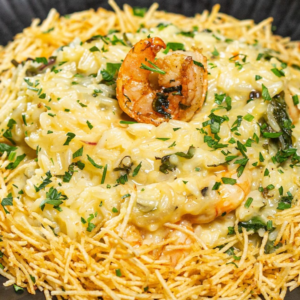 Arroz cremoso de camarão rosa (08 und gg), envolvido com o sabor do tucupi e frescura do jambu, queijo derretido, batata palha crocante e salsinha para finalizar o prato.