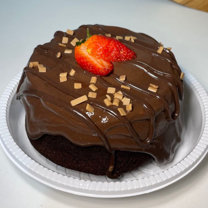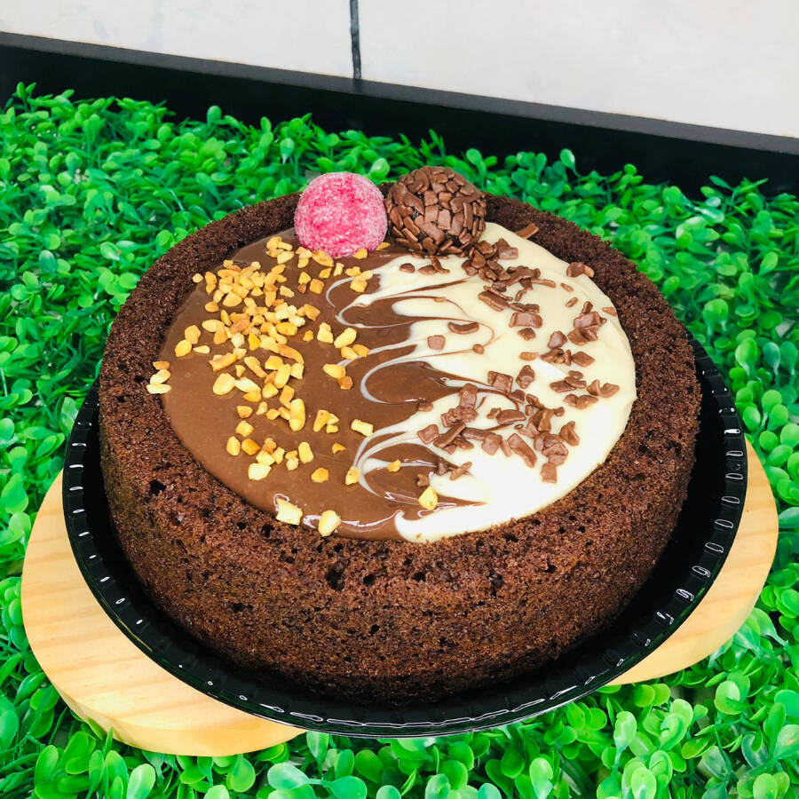 Este bolo possui uma suave massa de chocolate ou branca que harmoniosamente se divide entre um delicioso creme de ninho e chocolate, finalizado com amendoins, granulado, brownie e morango.