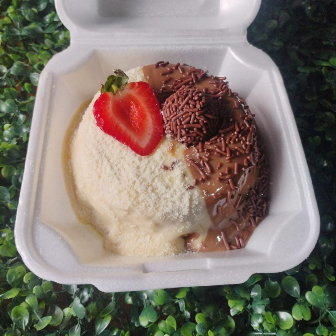 12cm cobertura de beijinho com brigadeiro, bolinhas de brigadeiro e beijinho com morango