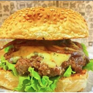 pão amanteigado, hambúrguer artesanal de 150g, fussão de queijo prato e mussarela, bacon, cebola caramelizada, e alface.