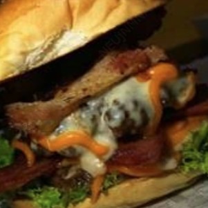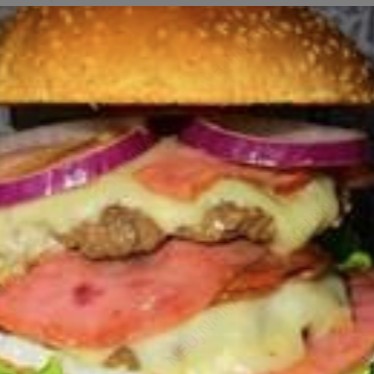 pão amanteigado, hambúrguer artesanal duplo de 100g, queijo prato, calabresa, bacon, ovo, presunto, cebola roxa, e alface.