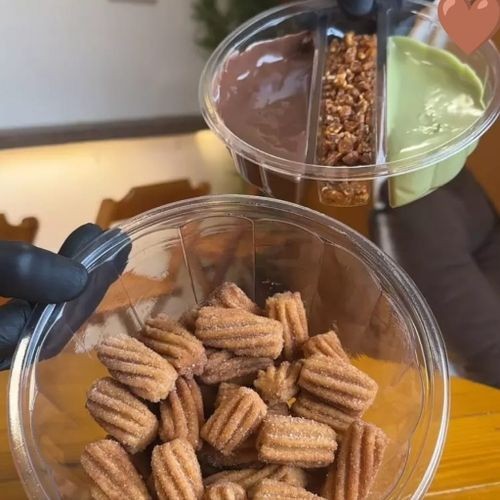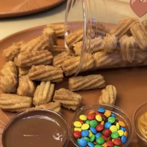 25 unidades de mini churros tradicional recheados com doce de leite e chocolate no centro da petisqueira com 60g de confeito.