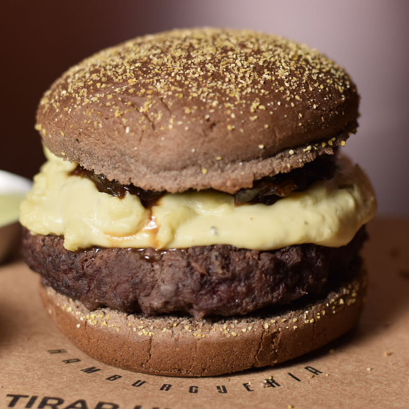 carne 160g,queijo prato,cebola caramelizada,bacon,geleia de pimenta e mainese da casa .