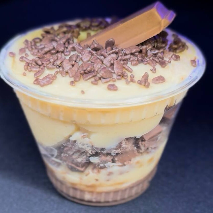 120ml. Mousse de maracujá, biscoito maisena e ganache de chocolate