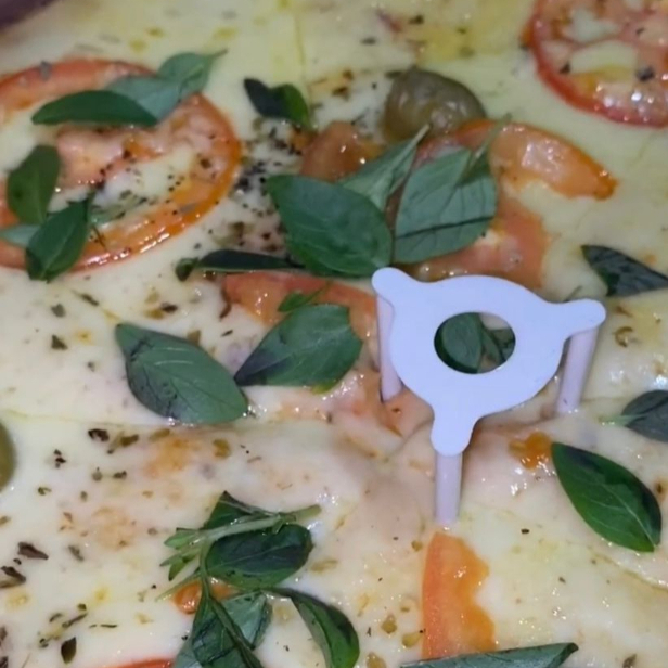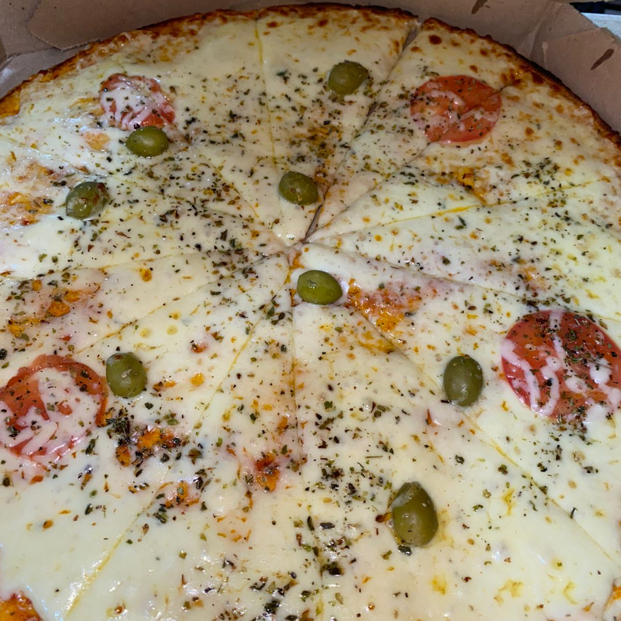 Molho, mussarelas, tomate, setalo, cheddar, parmesão, catupiry e orégano.
