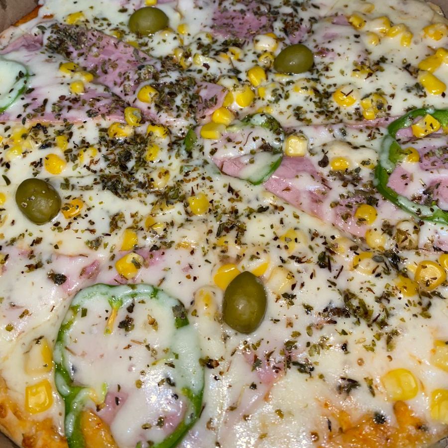 Molho, mussarela, presunto, cebola, pimentas, milho, ervilhas e orégano.