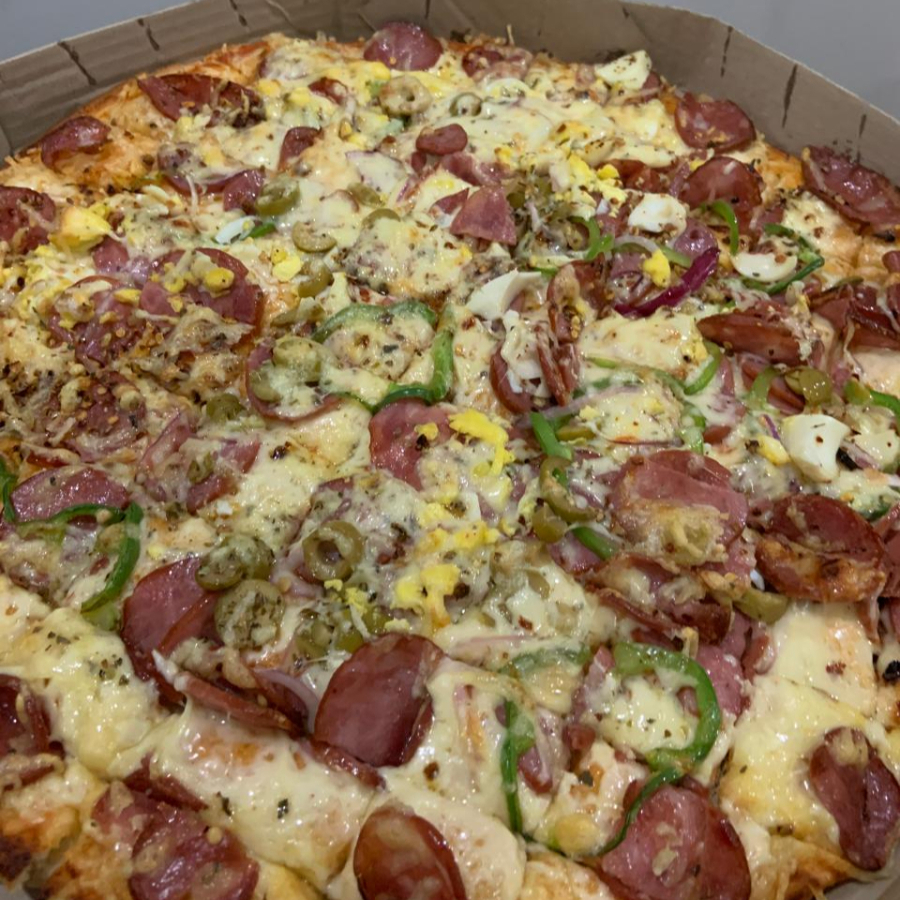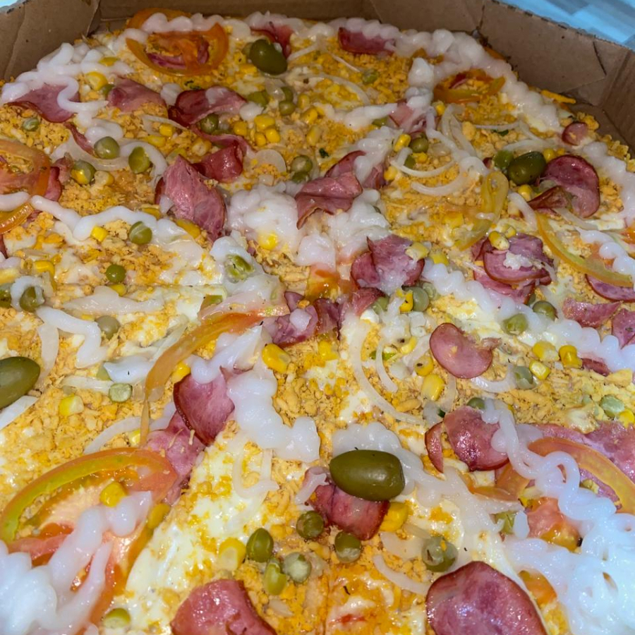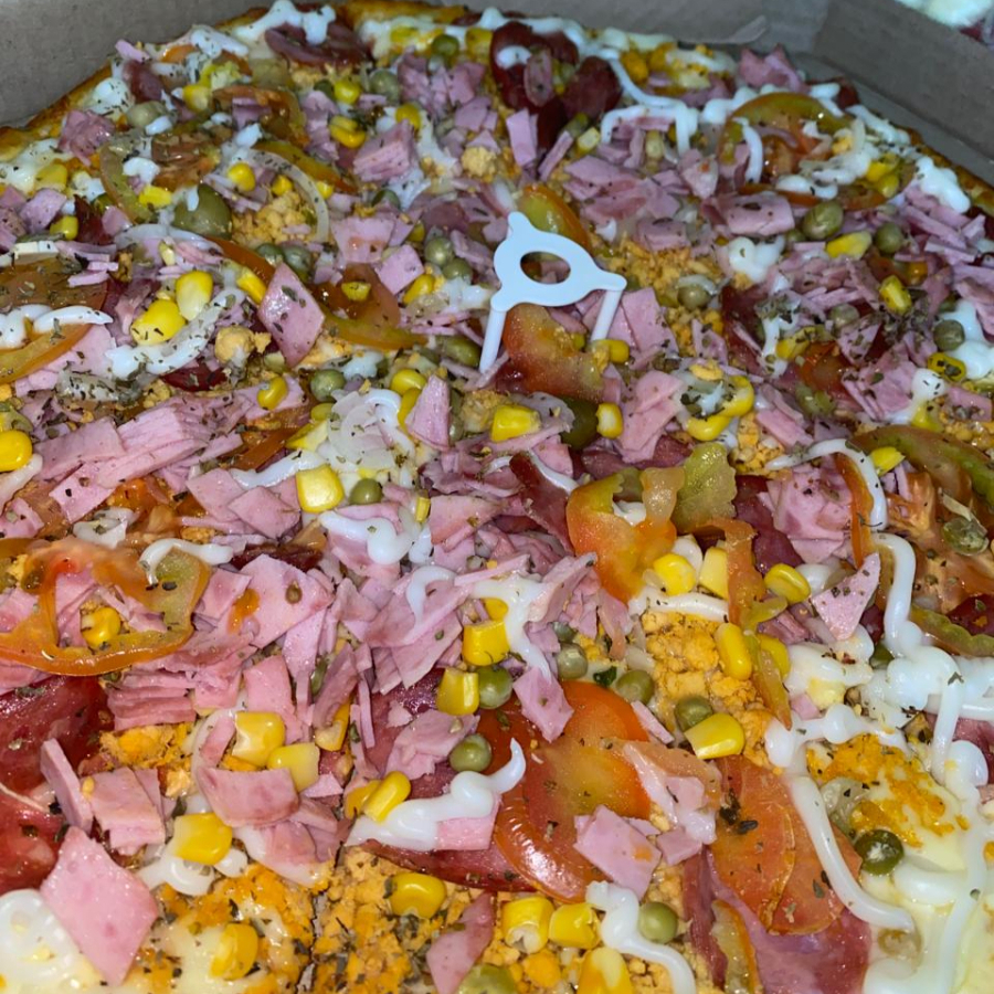 Molho, mussarelas, cebola, catupiry, calabresa, frango, presunto, milho e orégano.