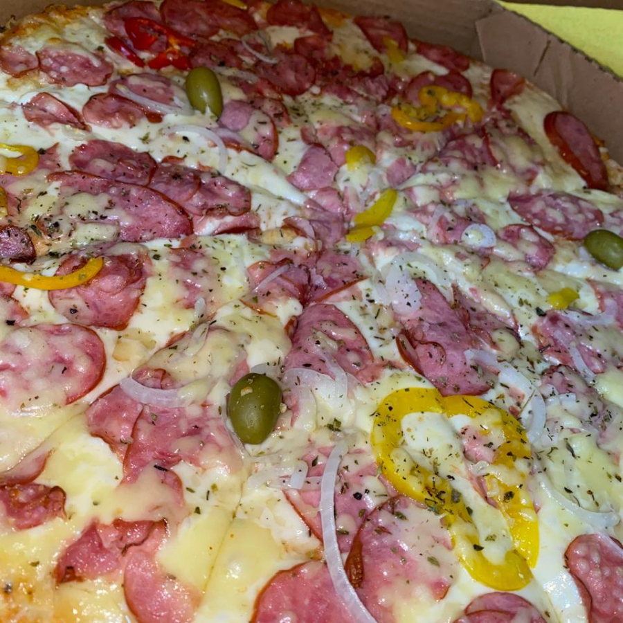 Molho, mussarela, calabresa, pimentas, azeitonas e orégano.