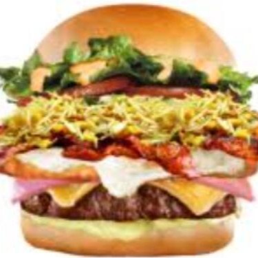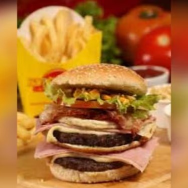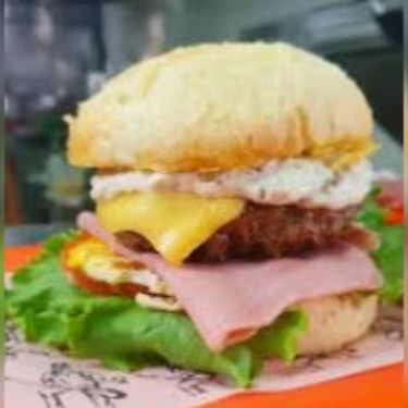 Pão bola, duas carnes, dois ovos, calabresa, uma fatia de queijo, uma fatia de presunto, batata palha, milho, tomate, pepino e alface.