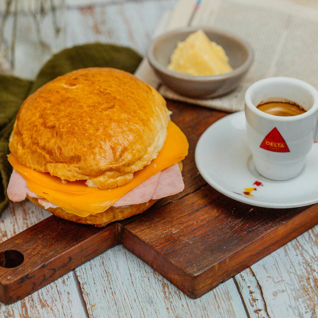 Pão de Leite quentinho com presunto e queijo + Café Expresso