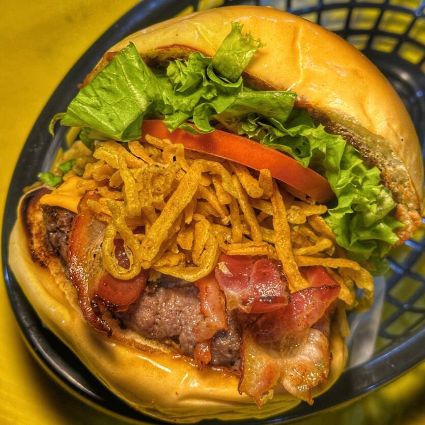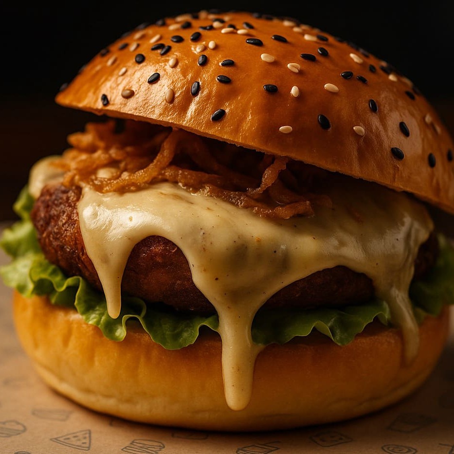 Pão Brioche, Blend de frango 140g, Molho Aioly, Mussarela, Cebola Crispy, Alface e tomate.
