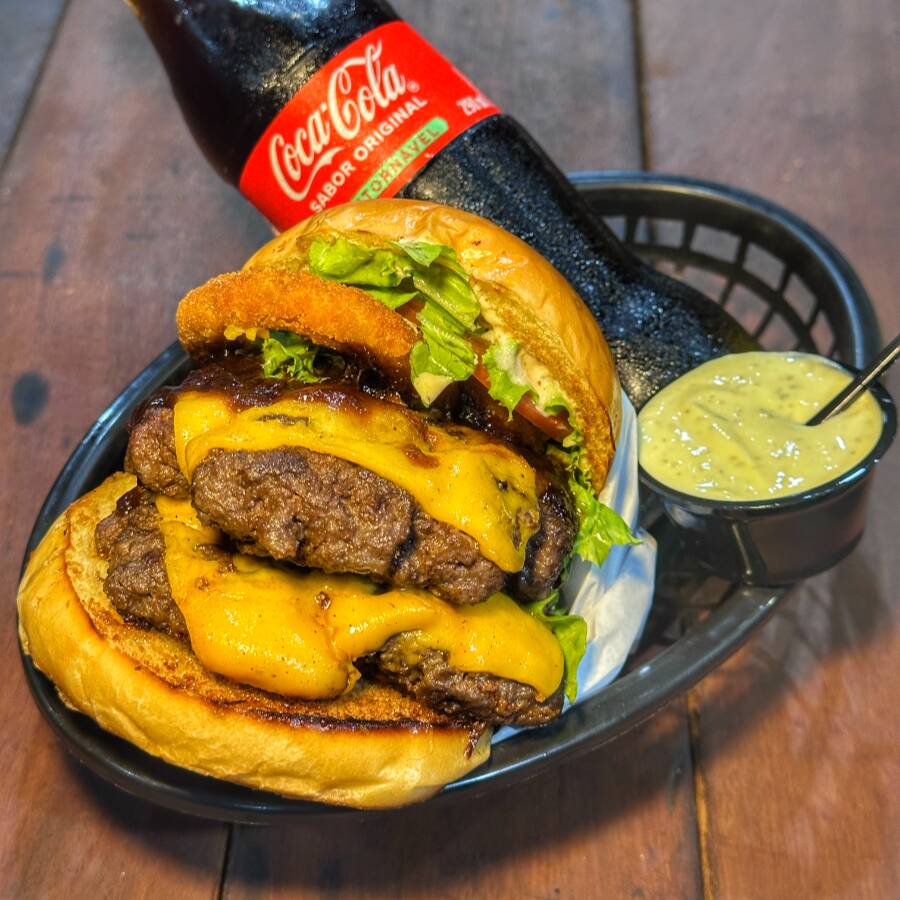 Dupla de smokes, 150g Batata Frita, 6 Onion Rings, molho de alho e chipotle + Coca 1L + Copo Star Wars Coca-Cola.