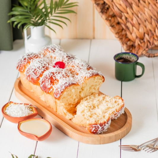 Pão doce fofinho, com uma leve cobertura de coco fresco e leite condensado.