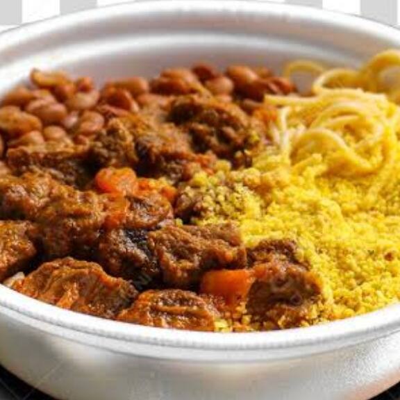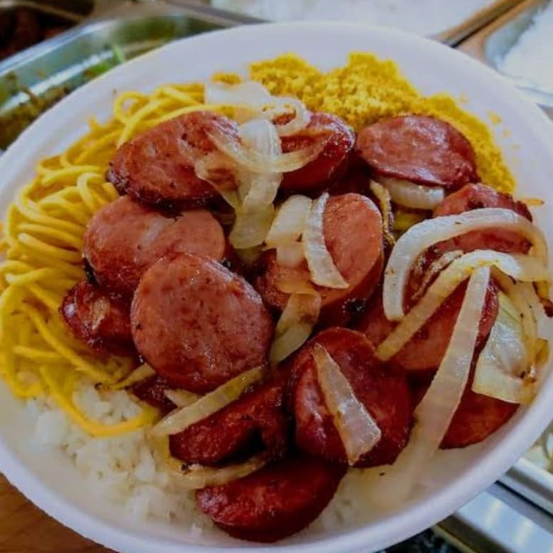 Arroz, feijão, macarrão e farofa. 1 ovo frito