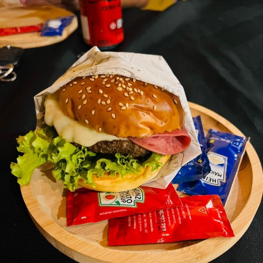 Pão, 1 carnes 180g, queijo, presunto, cheddar, ovo, calabresa, bacon, tomate e alface.