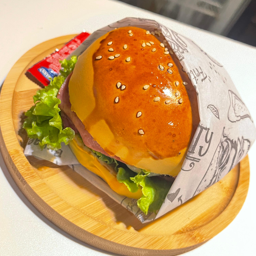 Pão, 2 carnes 180g, queijo, presunto, cheddar, calabresa, tomate e alface.