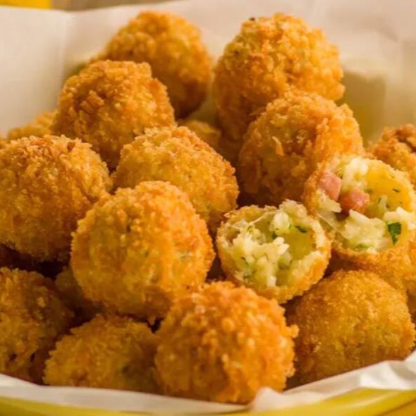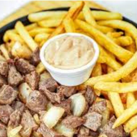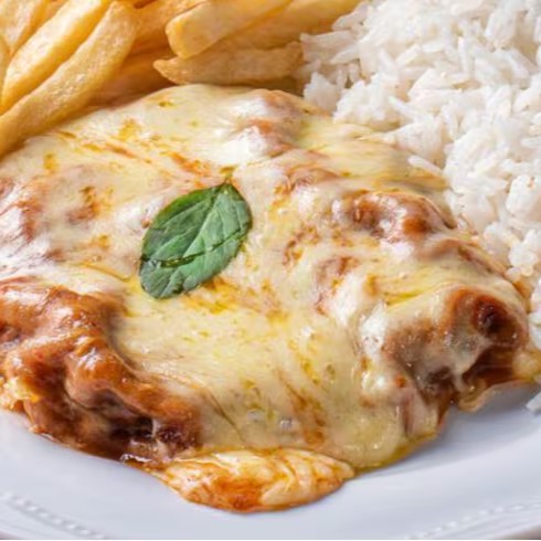 Serve de 2 a 3 Pessoas (File Coberto Com Queijo, Presunto, Acompanhado de Arroz Maluco com Bacon Crocante, Ovos e Batata).