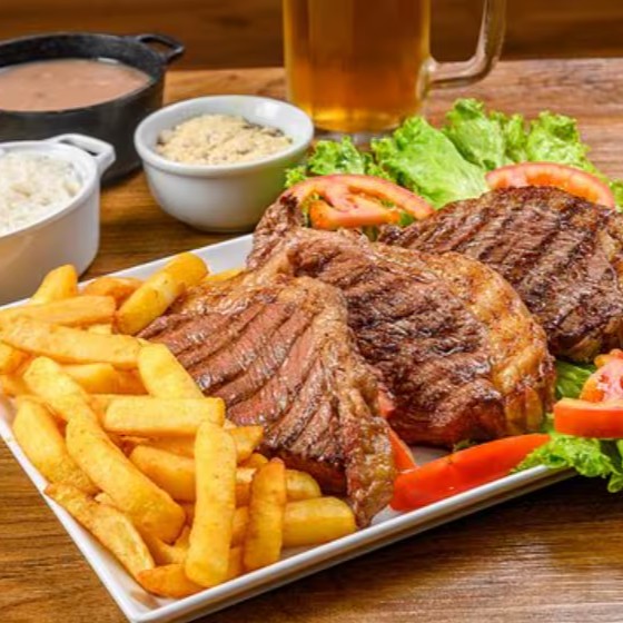 Acompanhado de Arroz, Macarrao, Salada, Feijao, Farofa e Batata Frita.