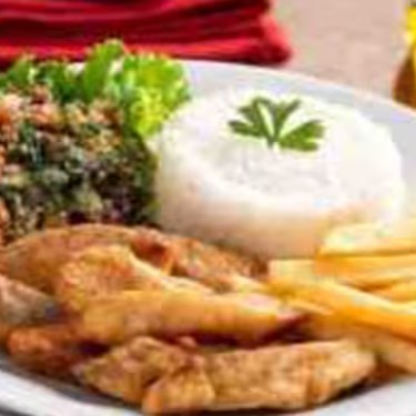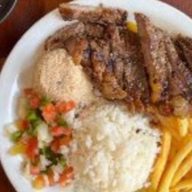 Acompnhado de Arroz, Macarrao, Salada, Feijao, Farofa e Batata Frita.