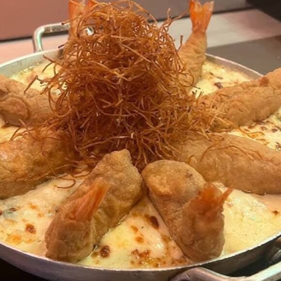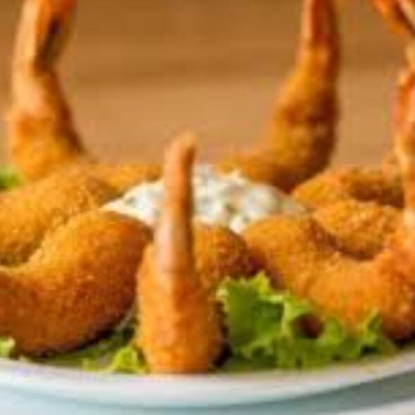 Serve ate 2 pessoas (Camarao Empanado Sobre o Arroz Cremoso com Presunto, Ervilhas, Batata Palha e Queijo Mussarela Gratinado).