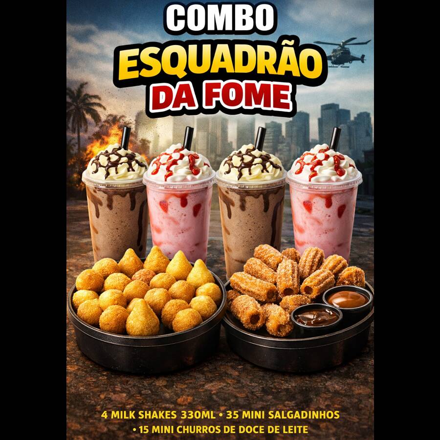 Quando a fome da equipe inteira aparece é hora de chamar reforço pesado. 4 milk shakes (330 ml) Sabor misto (Baunilha + morango)/ 35 mini salgadinhos tradicionais mistos,15 mini churros de doce de leite. Do doce ao salgado , esse combo é o combustivel oficial para a galera encarar qualquer missao ... Inclusive derrotar a fome coletiva.
