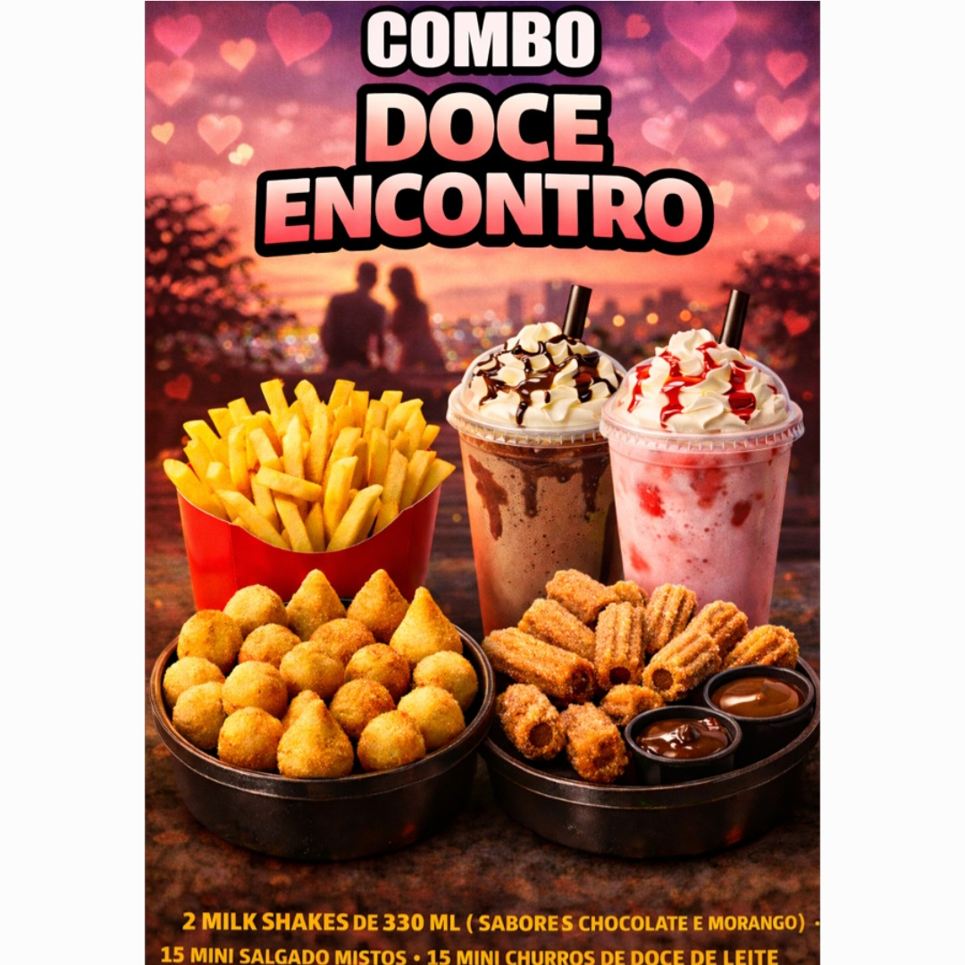 Alguns encontros são românticos . Outros são perigosamente deliciosos . -2 milk shakes (330 ml) sabor misto ( Morango + Baunilha) / 15 mini salgadinhos mistos,15 mini churros de doce de leite / 1 batata frita média. Do doce ao salgado, esse combo é para dividir ... Ou para descobrir rapidamente quem no encontro realmente esta disposto a compartilhar.