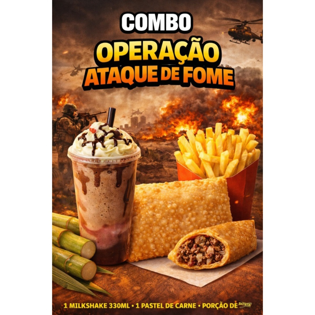 Quando a fome aparece sem avisar,é melhor estar preparado para agir sozinho.-1 milkshake (330ml) misto de Morango e baunilha\-1 pastel de vento de carne crocante\ -1 porcao de batata frita pequena. Dodoce ao salgado,esse combo resolve a missao rapido. perfeitopara quem auer encarar a fome... sem precisar dividir a recompensa