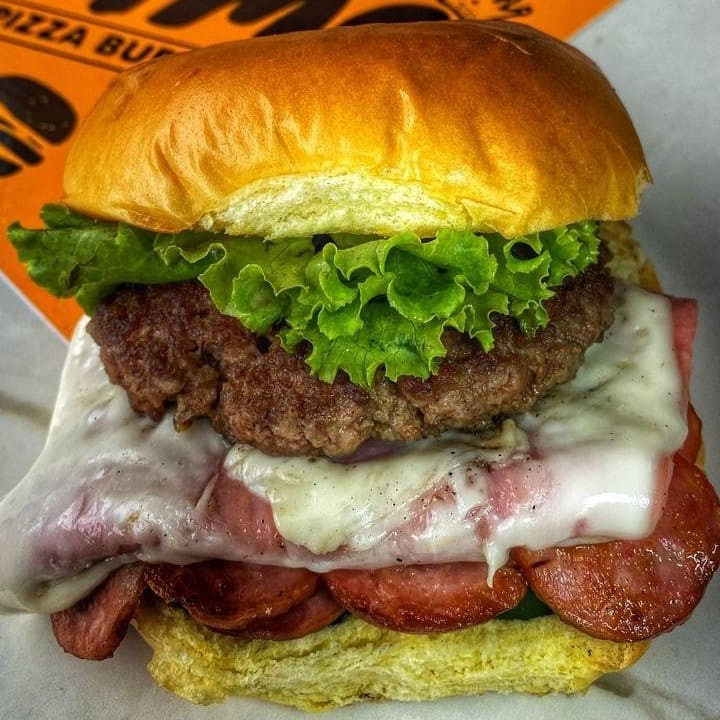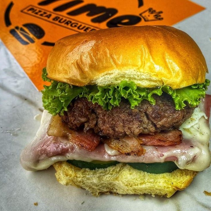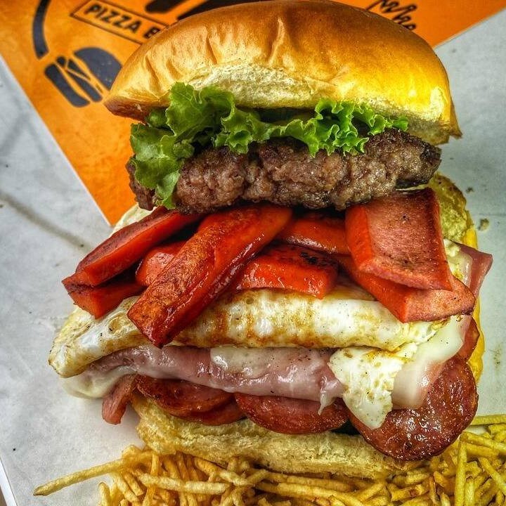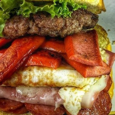 Pão bola, carne 80g, ovo, calabresa, queijo, presunto, salsicha, pepino, alface e batata palha!