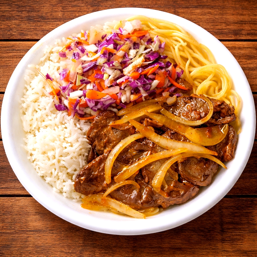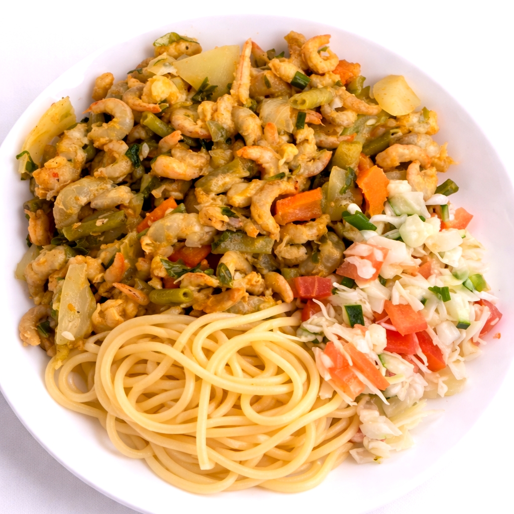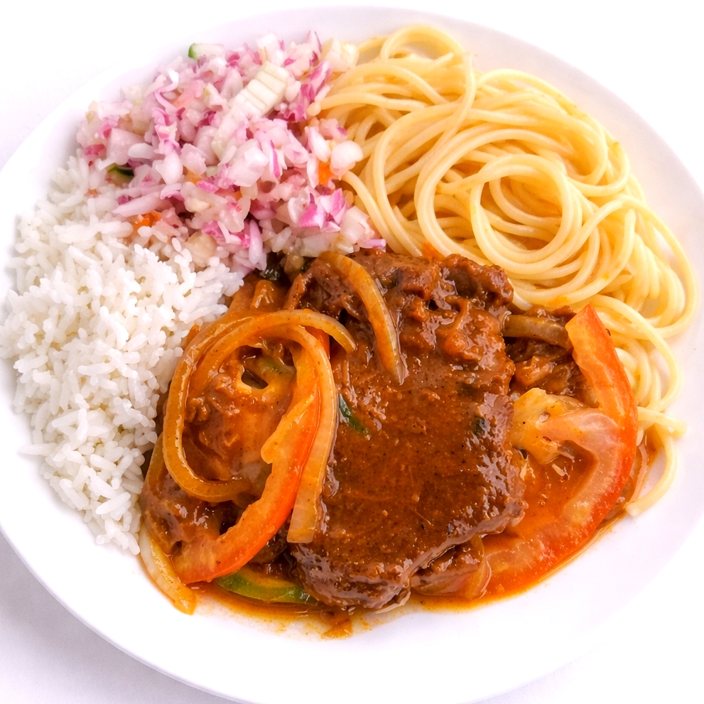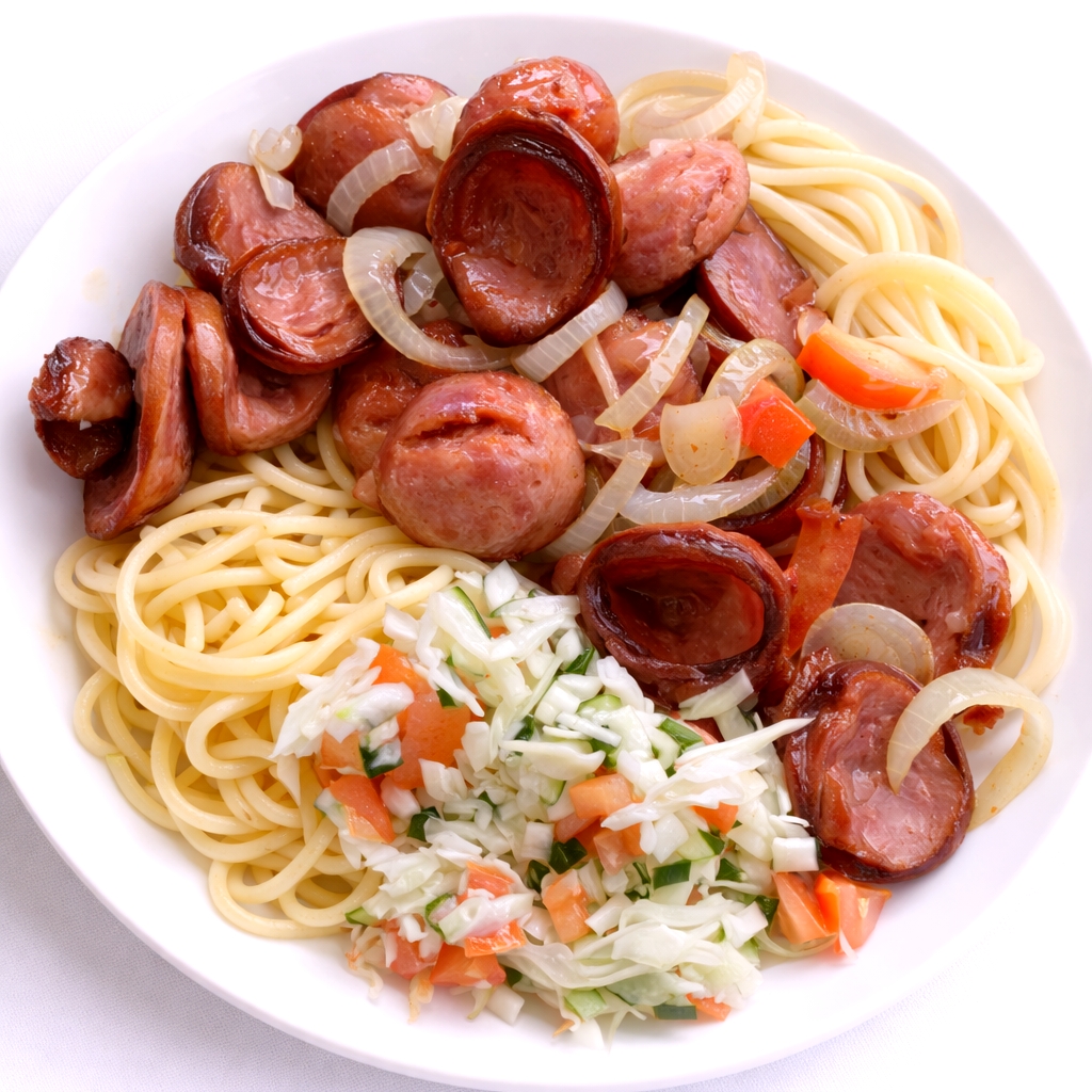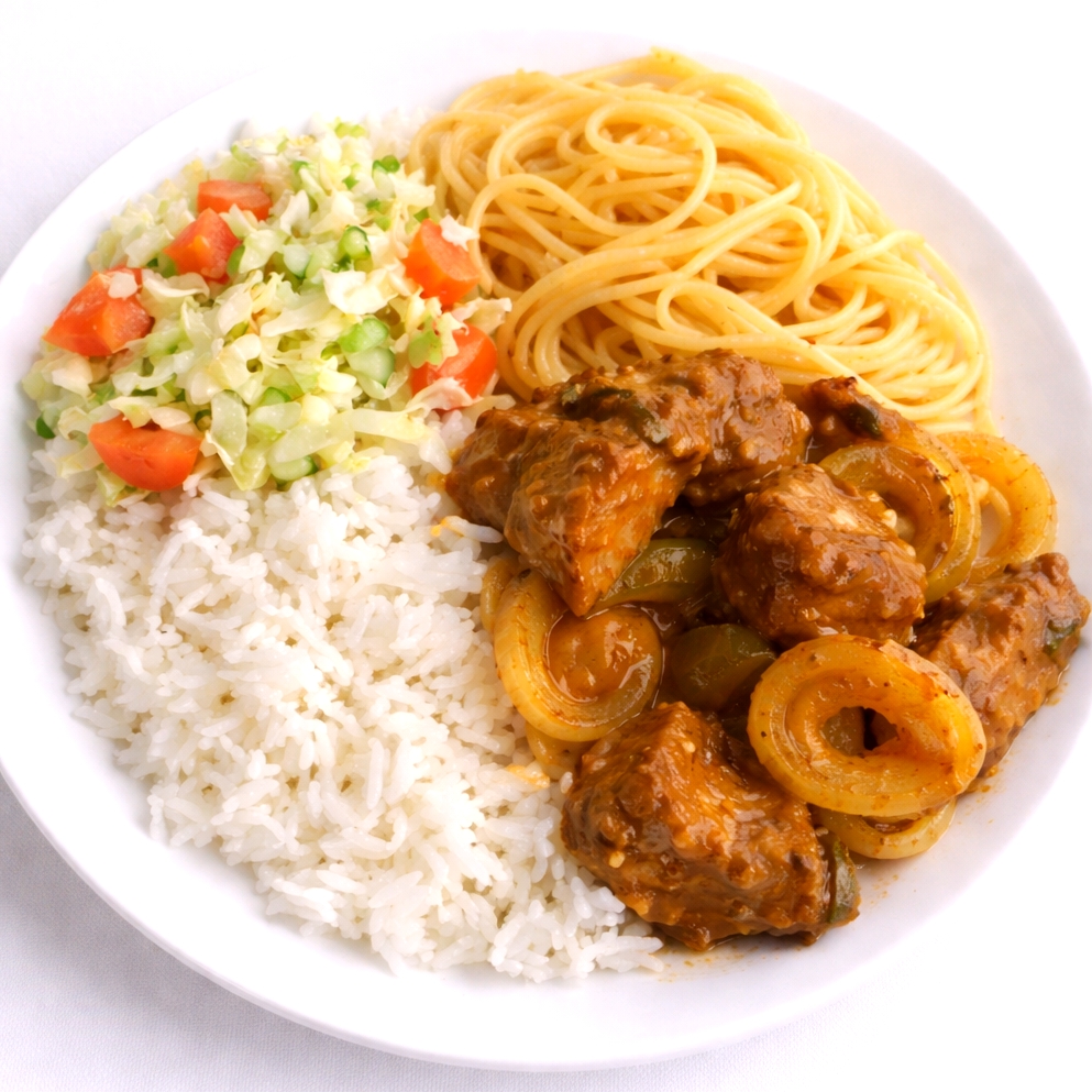 Acompanha arroz, macarrão, salada, feijão e farofa