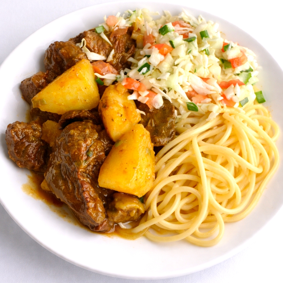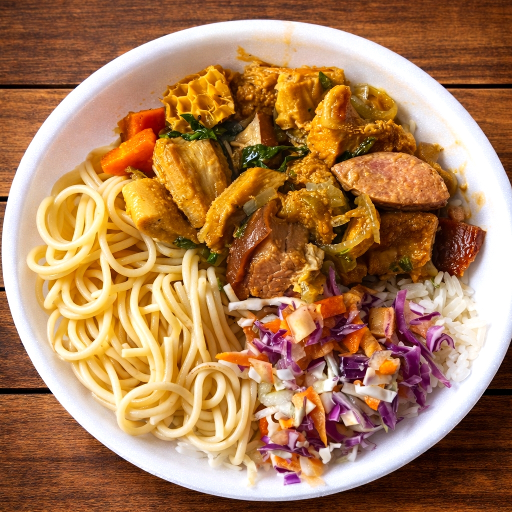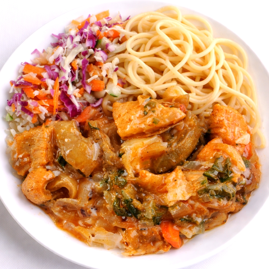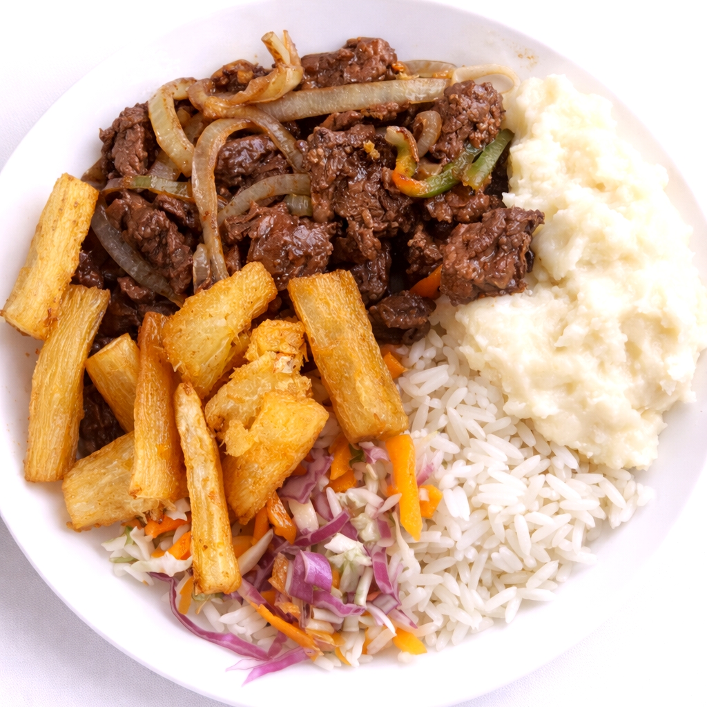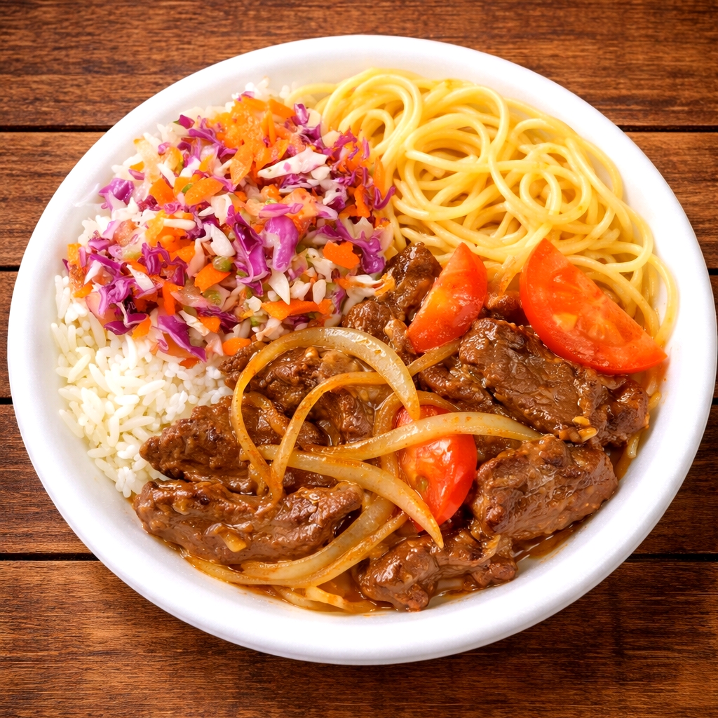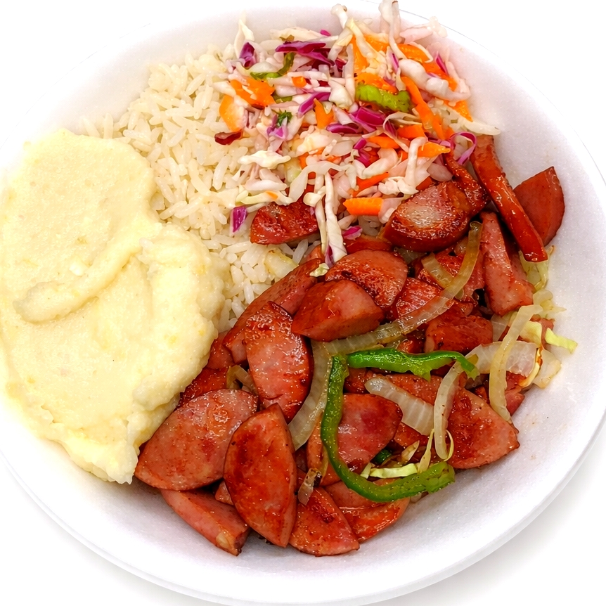 Acompanha arroz, macarrão, salada, feijão e farofa