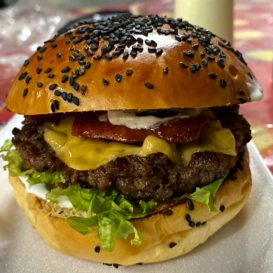 Pão, carne, calabresa, queijo mussarela, tomate e alface.