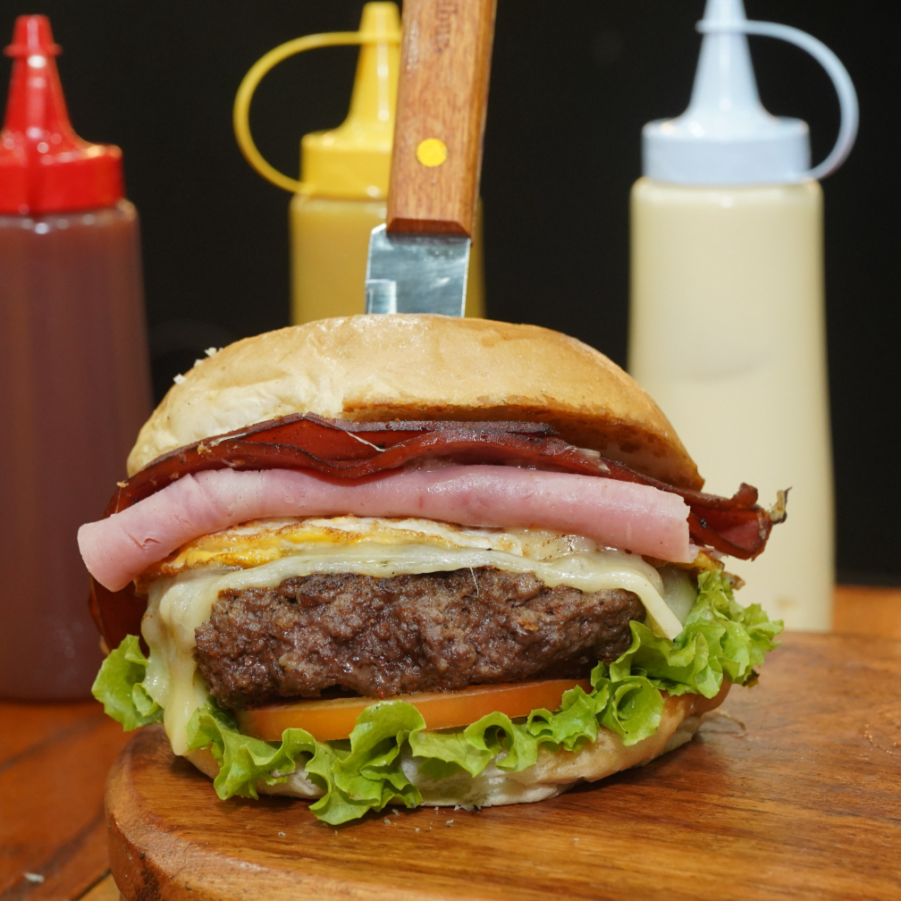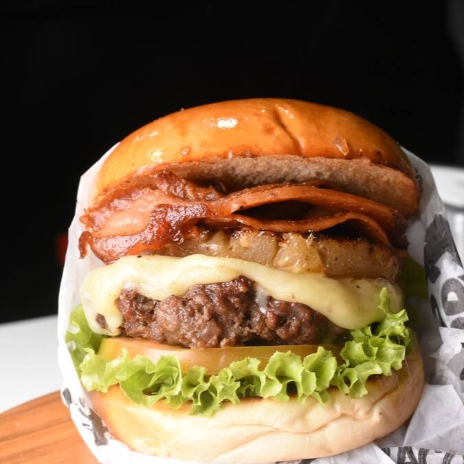 Pão,carne na brasa, bacon, abacaxi grelhado na churrasqueira e maionese da casa.