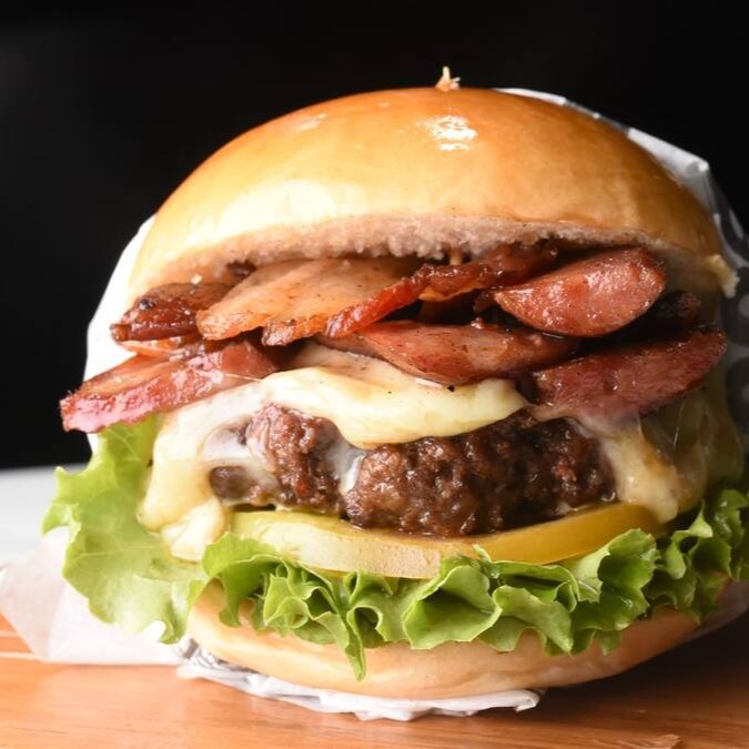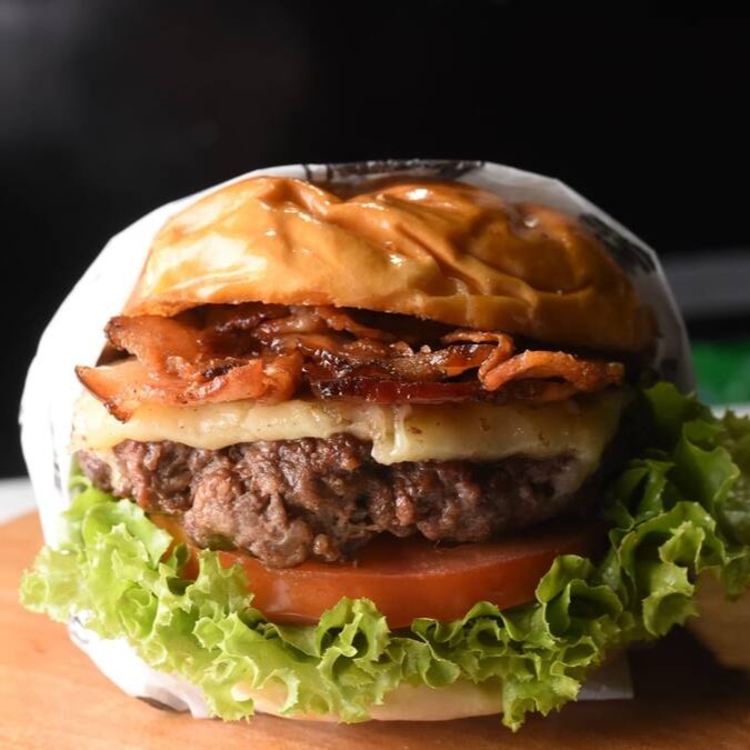 Pão, carne, queijo mussarela, fatias de bacon, alface e tomate.