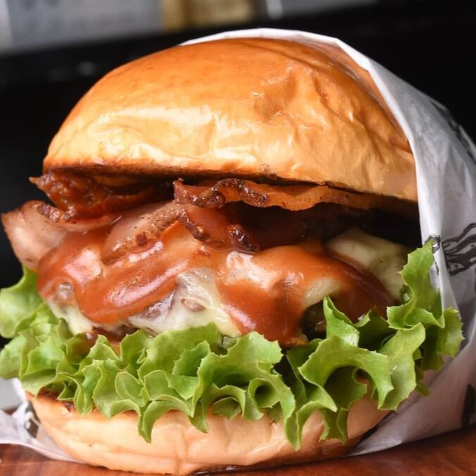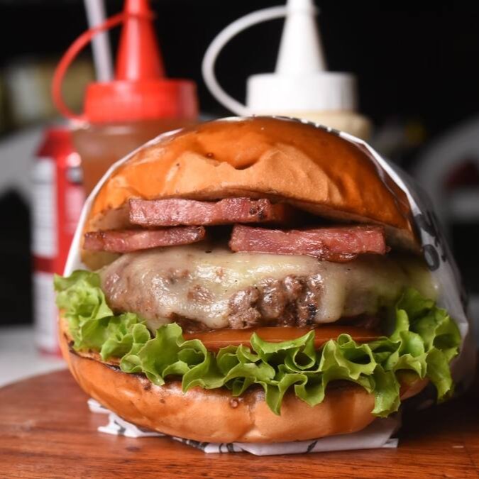 Pão,carne, queijo mussarela,bacon, molho de pimenta, alface e tomate.