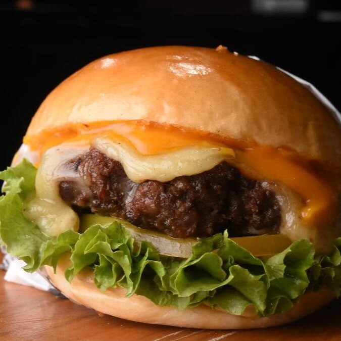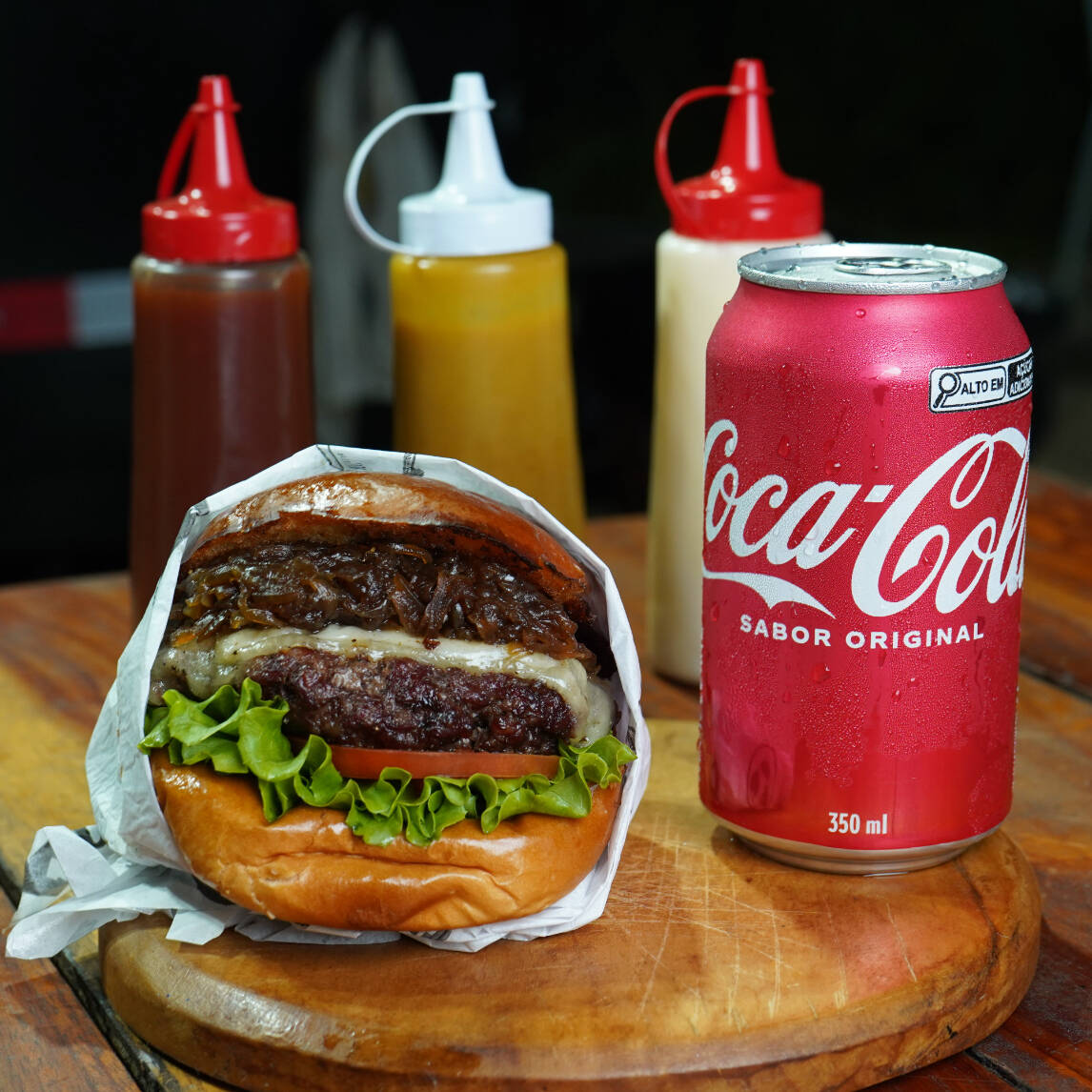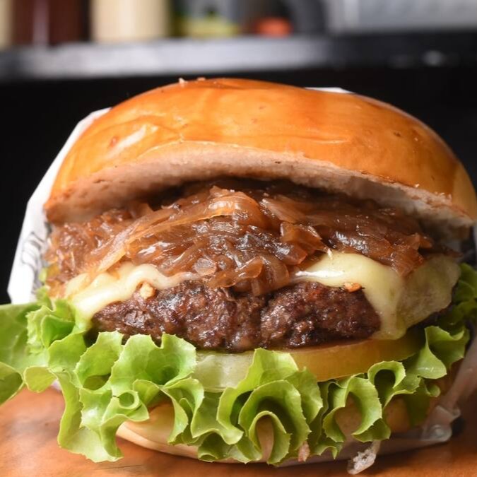 Pão, carne, queijo mussarela, cebola caramelizada, alface e tomate.