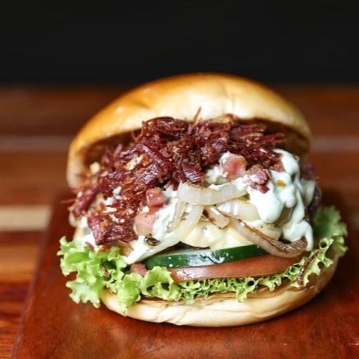 Pão, carne assada na brasa, queijo mussarela, bacon, cebola chapeada e charque desfiado.