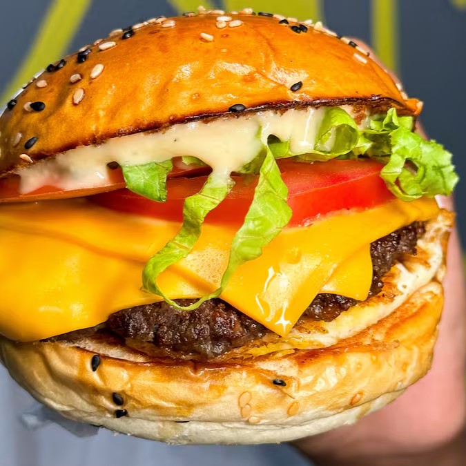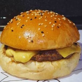 Pão com gergelim, blend (100g) e queijo cheddar.