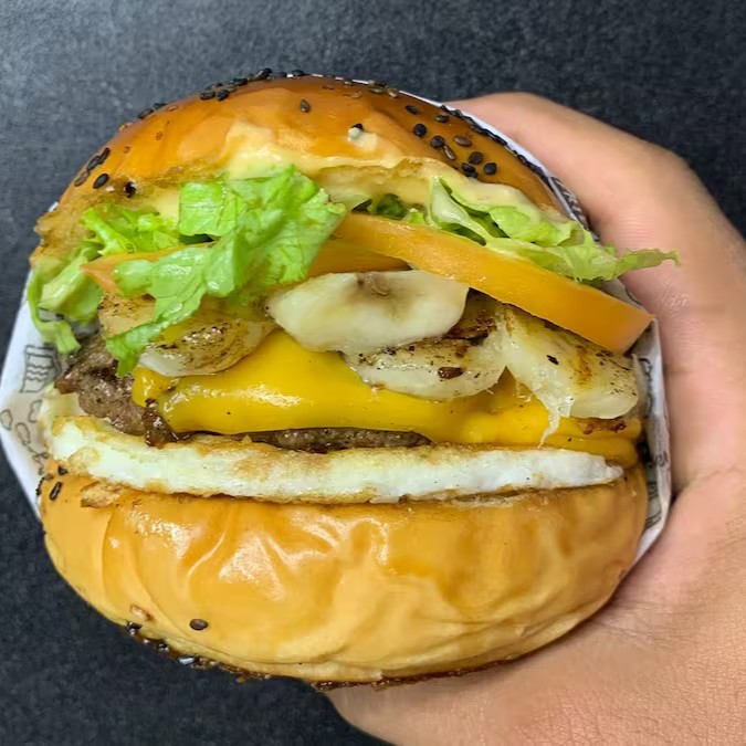 Pão com gergelim, blend 120g, banana, queijo cheddar, molho mac, tomate e alface.