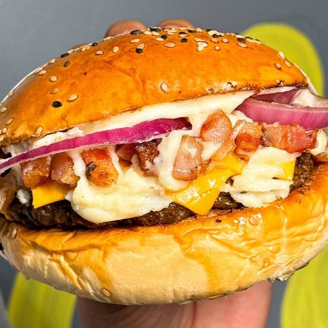 Pão com gergelim, blend 150g, bacon em cubos, Catupiry, queijo cheddar e cebola roxa.