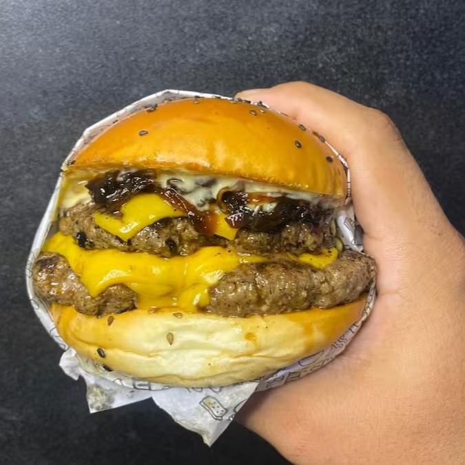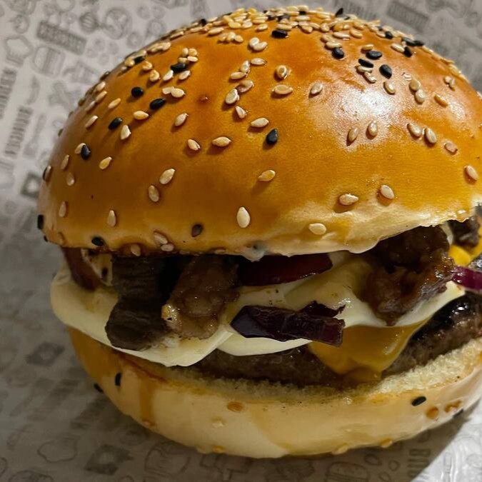 Pão com gergelim, 2x blend 120g, calabresa, queijo cheddar, cebola caramelizada e molho mac.