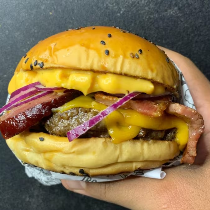 Pão com gergelim, blend 150g, queijo cheddar, bacon, muito creme cheddar e cebola roxa.